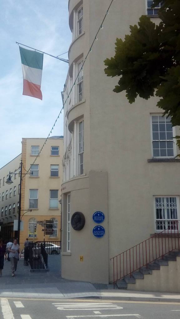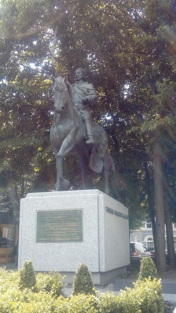 A statue for Meagher, now stands in the street, underneath the Flag. Sentenced to death, for his part in the Young Ireland Rising, the sentence was commuted to deportation to Van Diemens Land. He escaped and made a new life in New York City. During the Civil War (1861-65) he was the General commanding the Irish Brigade. After the war, he was appointed Governor of the Territory of Montana. He died in mysterious circumstances, most likely by falling overboard from a paddle steamer. His body was never found.
