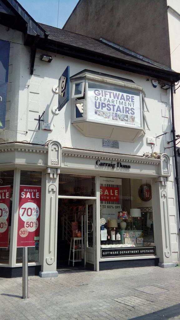 The plaque above this store in the main street, commemorates John Moore who was President of the Republic of Connacht during the 1798 Rebellion. When the rebels were defeated he was taken to Waterford for transportation to Australia. He died in this building then the Royal Oak coaching inn en route to New Geneva Gaol. His grave was re-discovered in 1960 and the body exhumed and re-buried in Castlebar, County Mayo.